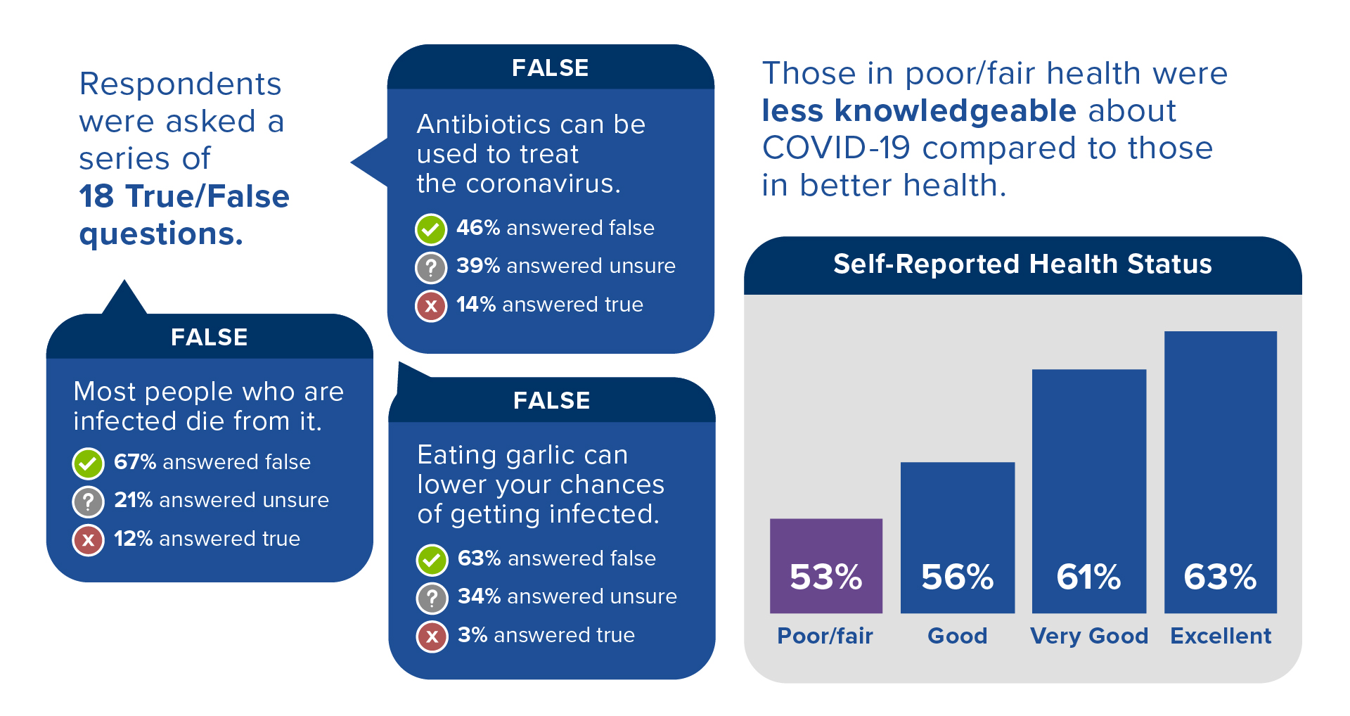 While 86 percent of respondents had seen, read, or heard either a fair amount or a great deal about COVID-19, overall survey results showed there were deficits in respondents’ knowledge. One-third of respondents incorrectly believed that most people infected with the COVID-19 will die from it, while 59 percent knew that most people who are infected recover from it.