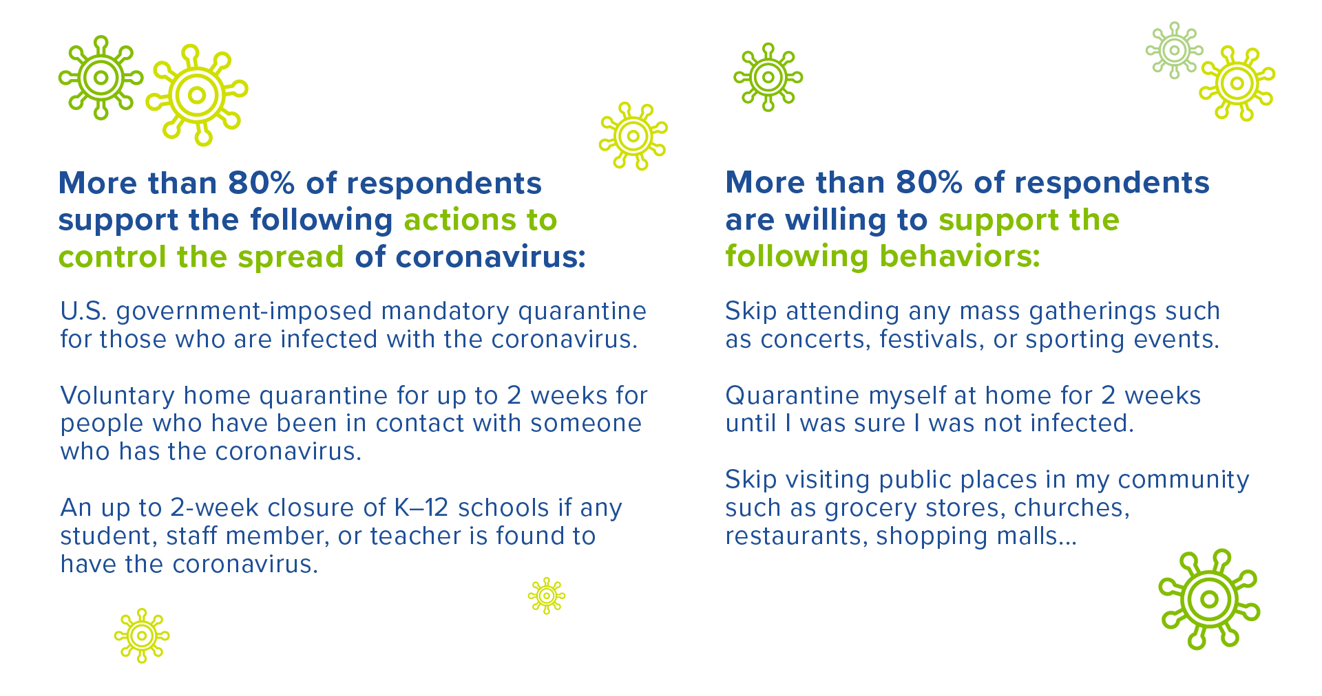 When asked about possible community mitigation strategies to control spread of the virus, 89 percent of respondents said they would support a U.S. government-imposed mandatory quarantine for those who are infected with the virus and voluntary home quarantine for up to two weeks for people who have been in contact with someone who has COVID-19.