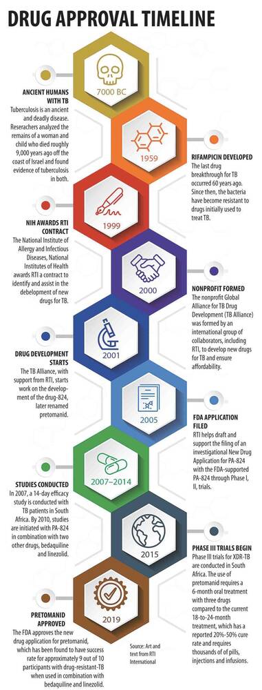Developed by TB Alliance, a non-profit public-private partnership that RTI helped to form in 2000, pretomanid is only the third new anti-tuberculosis drug approved by the U.S. Food and Drug Administration (FDA) in more than 40 years. It has been approved by FDA as a treatment for extensively drug-resistant tuberculosis (XDR-TB), a type of TB that is resistant to two of the four main drugs that are given for TB around the world, plus any fluoroquinolone and one or more of three injectable second-line drugs.