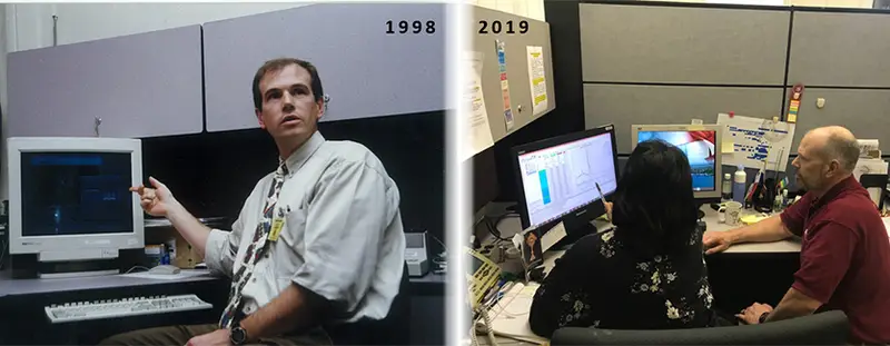 The CWR-ACP relationship spans 20 years. Left: Michael Kane giving a demonstration of the first PANFCST system to the Canal administrator in 1998 (photo by PCC). Right: Tamara Muñoz, a hydrologist in the Water Resources Section at the ACP, reviewing a recent forecast with Michael Kane in 2019 (photo by Mark Woodbury).