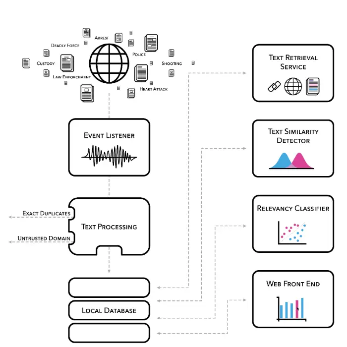 To solve this problem, we developed an automated coding and classification pipeline of online media data using text analytics and machine learning techniques. A potential arrest-related death was determined by processing news articles through a successive set of filters, starting with the universe of all news articles and ending with unique events (see Figure 1). The pipeline identifies potential cases that can be subsequently verified by human coders to form a comprehensive and timely count of arrest-related deaths.