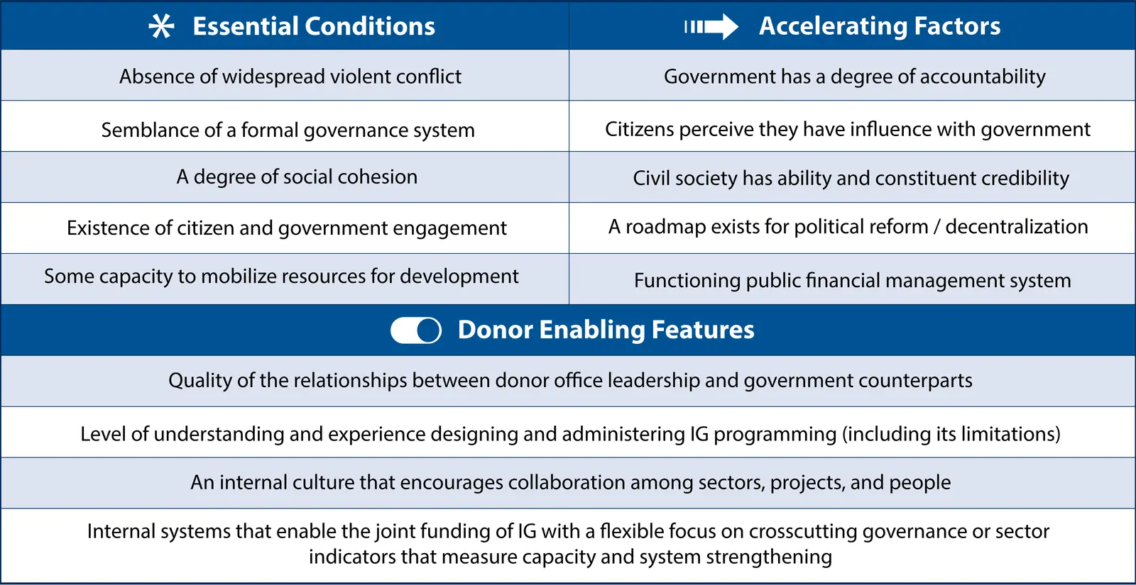Our research identified some essential conditions (minimum contextual elements) and accelerating factors (elements that made IG success more likely) to consider when deciding if a country is “ready” or will facilitate the success of IG programming. We also learned what donor features enable IG success.