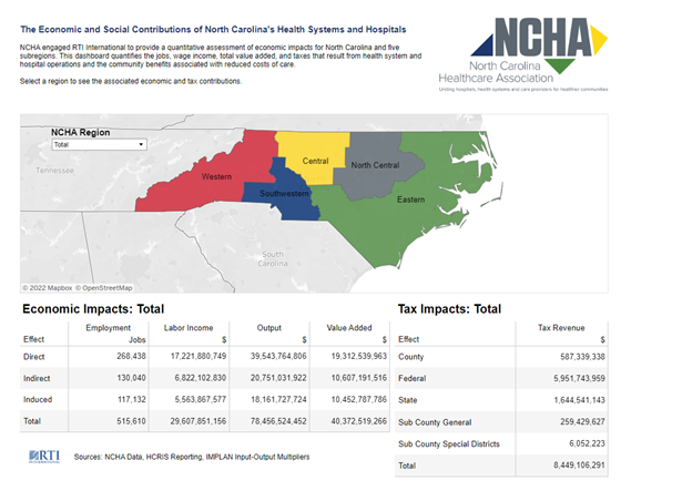 Although the recent COVID-19 pandemic heightened public awareness of hospitals’ key role in community response to emerging health risks, the economic impacts that health systems and hospitals have on their communities are less understood. Recently, our team at RTI collaborated with the North Carolina Healthcare Association to estimate the economic impacts and social contributions of health systems and hospitals in North Carolina to show just how important these institutions are to the State’s economy.