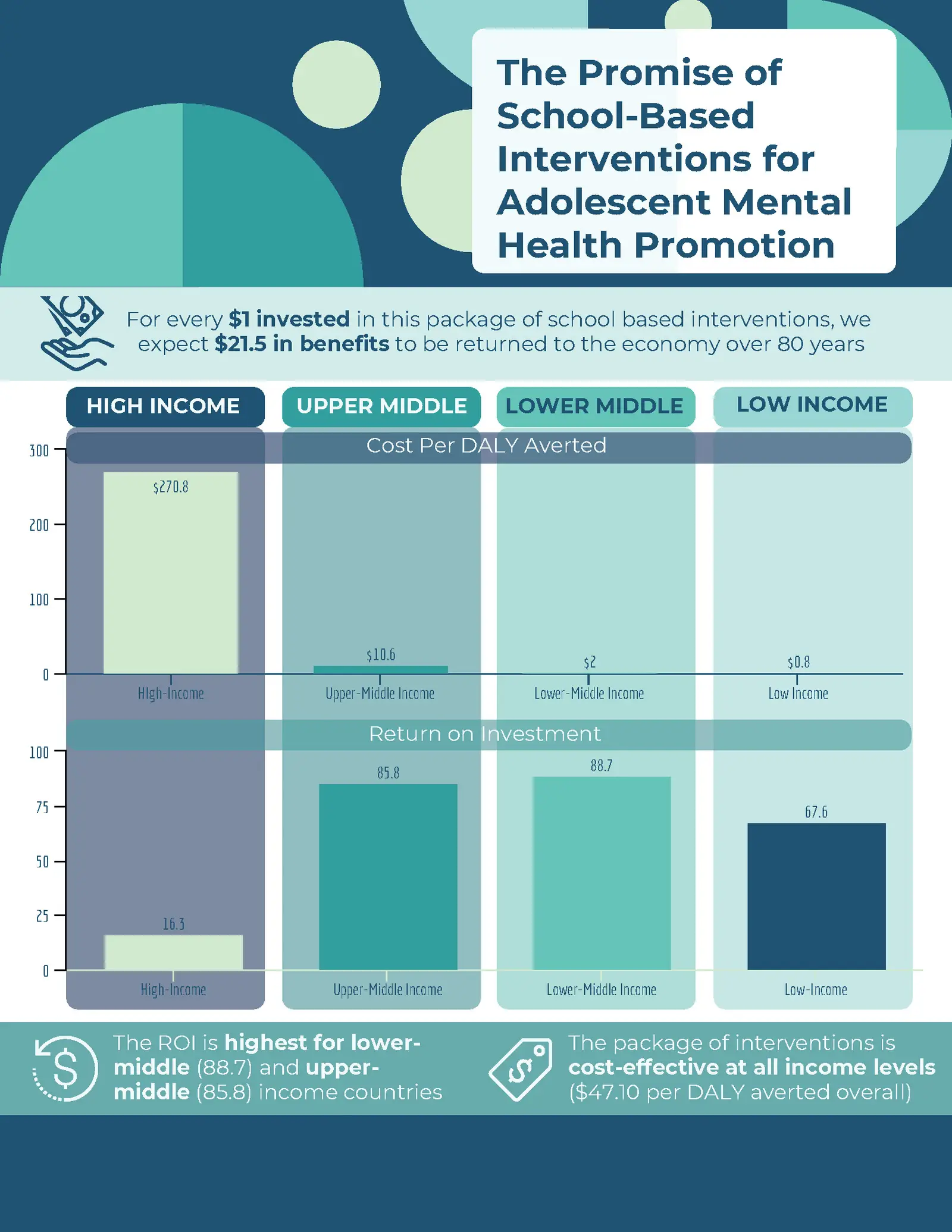 This intervention package demonstrates a strong ROI that compares favorably to other child health interventions. The package of school-based interventions is therefore a cost-effective option for governments to address unmet mental health needs among their young populations and to avert the adverse health, social, and economic impacts of mental disorders.