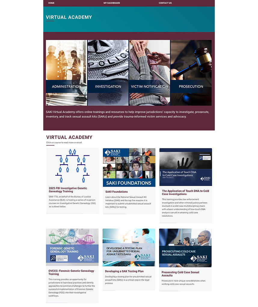 RTI’s subject matter and communication experts developed a variety of resources and tools to educate audiences on SAKI's primary focus areas: sexual assault kit administration and testing, victim notification, investigation, and prosecution. One highlight is the SAKI Toolkit, which lets users customize their own training materials by building a briefcase of resources—briefs, articles, videos, and webinars—they can use and share with others. To facilitate use and adoption, RTI also created pre-packaged briefcases for multidisciplinary team leaders, sexual assault investigators, SAKI site coordinators, and sexual assault prosecutors. Our team also worked with subject matter experts to create the SAKI Virtual Academy, which provides more than 50 trainings focused on sexual assault kit administration and testing, victim advocacy, and cold case investigation and prosecution. The trainings are structured based on adult learning principles, with supporting scenarios, case studies, and knowledge checks that allow for active learner practice.