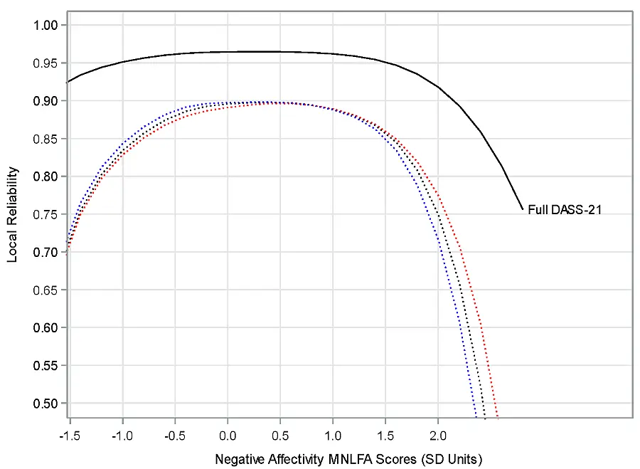 In the validation sample, both the full DASS-21 and the DASS-6 were scored treating the MNLFA item parameter estimates in the calibration sample as fixed item parameters in the validation sample. Local reliability was then assessed for both the full DASS-21 and the DASS-6. Under CTT, the most common measure of reliability (at least as defined here as internal consistency) used in practice is, of course, Cronbach’s α. Under CTT, α presumes that the reliability of a score is constant throughout the range of the construct, which is often unrealistic in practice. In factor analysis/item response theory (FA/IRT), the concept of reliability is “local,” or specific to different levels of the construct (Embretson & Reise, 2000); for health outcomes research, a measure is ideally at its maximum reliability at the level of the construct at which a diagnostic decision is made (Chiesi et al., 2017; Morgan-López et al., 2020). To calculate and graph local reliability (LR), test information function (TIF) values are output, where TIF values are the expected value of the inverse of the error variances for each estimated value of the latent construct score; these values can be requested as output from Mplus. Then, the TIF values are converted to LR values using 1 – (1/(TIF)) for each specific value of the latent construct score.