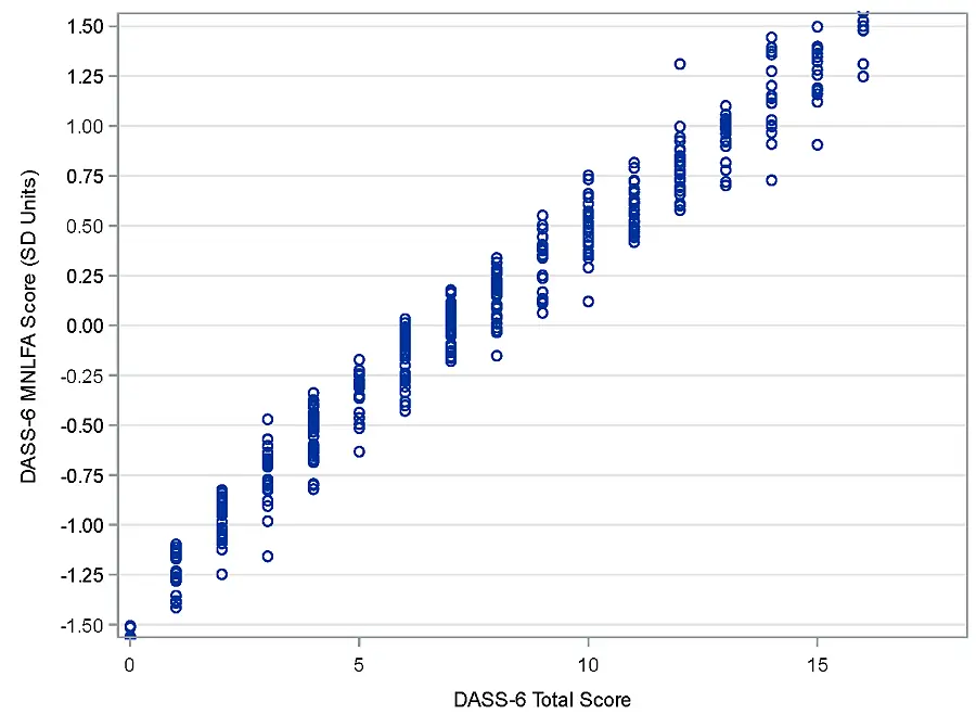 Table 5 presents clinical validation metrics across a selected range of NA. At 0.5 SDs) above the mean DASS-6 MNLFA scale score (close to the 0.39 SDs used for IIC selection), PPVs (e.g., the proportion of patients with a depression diagnosis that would have been detected as such with the DASS-6) ranged from 0.88 to 0.95 across the three disorders, while NPVs (e.g., the proportion of patients without a depression diagnosis that would have depression ruled out with the DASS-6) ranged from 0.53 to 0.64. The DASS-6 MNLFA cut score roughly translates to a DASS-6 total score of 10, with some patients reaching the clinical range with scores of 8 (depending on the combination of symptoms); because of the differences in item weighting via factor loading variation across items, the same total score can lead to a different MNLFA score estimate and vice versa (Morgan-López et al., 2024; Saavedra et al., 2021, 2022). The correlation between the DASS-6 total scores and MNLFA scores (r = 0.98) with a scatterplot shown in Figure 3. Selection of a DASS-6 cut score with a high PPV and low-to-moderate NPV reflects a clinical context where false negatives are more acceptable than false positives, such as patients who may be in subthreshold clinical distress that could still benefit from treatment (Trevethan, 2017).