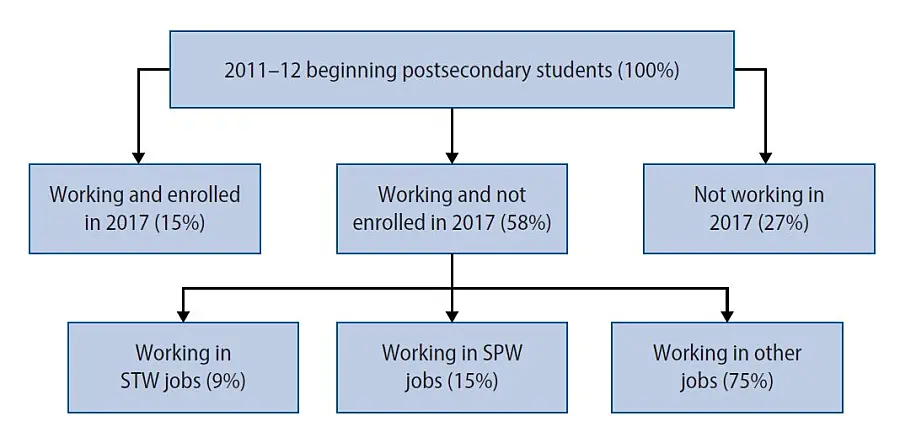 By 2017, about 6 years after college entry, 58 percent of 2011–12 beginning postsecondary students were working and not in school and, among these workers, 9 percent held STW jobs that required high-level technical expertise but not a bachelor’s degree.