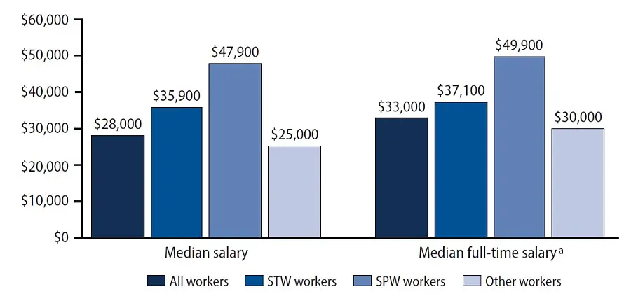 Salary. The median salary of all workers in the 2011–12 BPS cohort was $28,000 (Figure 3). The median salary of STW workers ($35,900) and SPW workers ($47,900) was higher than the median salary of all workers ($28,000) and workers in nontechnical jobs ($25,000). These gaps were also observed among full-time workers.