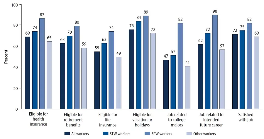 Job benefits. Overall, 69 percent of all workers in the 2011–12 BPS cohort reported that they were eligible for health insurance through their job, 63 percent were eligible for retirement benefits, 55 percent were eligible for life insurance, and 76 percent were eligible for vacation or holidays (Figure 4). SPW workers were most likely to report eligibility for these benefits. STW workers came in a close second, whereas other workers were least likely to report eligibility status for these benefits.