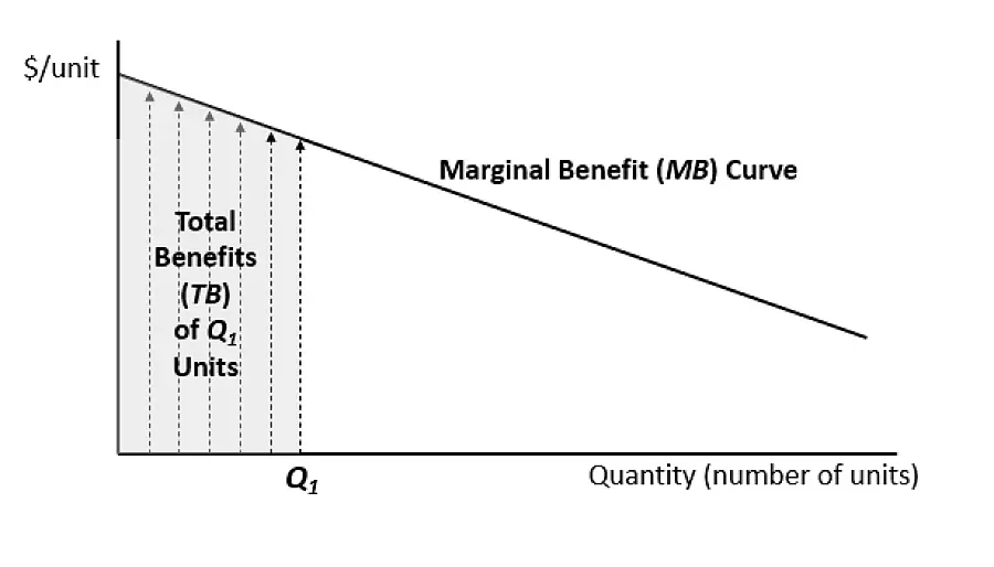 Regardless of how a water resource is used, its value in any particular use can typically be represented by a marginal benefit curve, as shown in Figure 2. The horizontal axis represents the quantity of water used. The height of the marginal benefit curve, shown by the arrows, represents the maximum WTP for each additional unit of water for the specified use (and time period). The marginal benefit curve has a downward slope to represent declining marginal benefit. For example, if water is used to irrigate farmland, the first several units used will have relatively high value (i.e., WTP) for farmers, but the value of additional units will eventually decline as they provide less and less additional benefit to the farmer. If the amount of water used in this specified activity is equal to Q1, then the total benefit (and hence the total value) of this specific water use is represented by the area under the marginal benefit curve up to Q1, as shown in Figure 2.