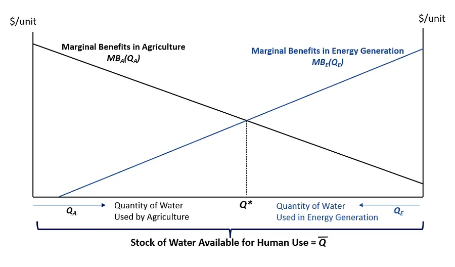 At this optimal allocation, the total combined value of water in the two uses is maximized (i.e., the total area under the two marginal benefit curves is maximized). This point also refers to the equimarginal principle, which dictates that the optimal allocation of a finite resource will occur at the point in which the marginal benefits are equal between competing users of the resource.