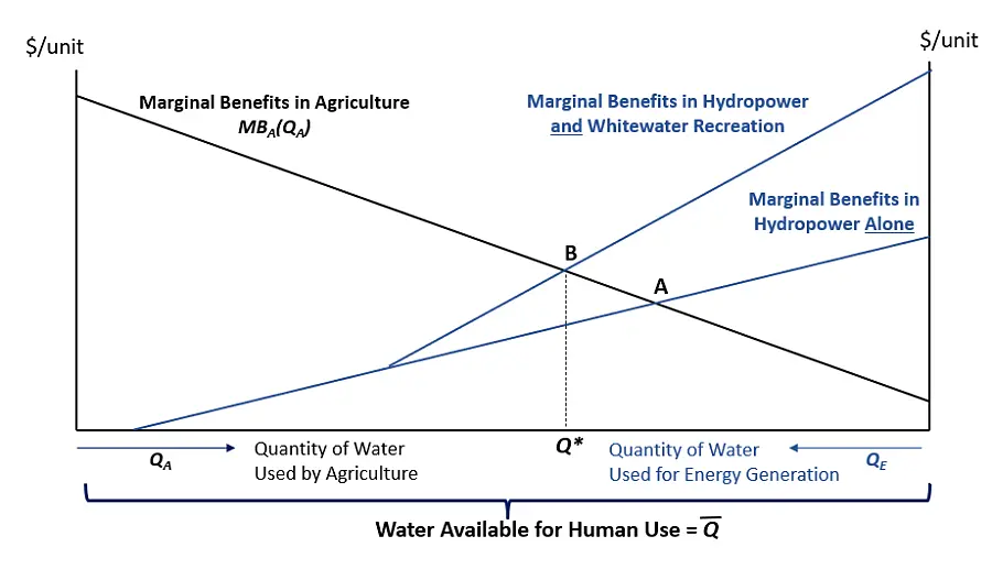 This simple one-period example can be adapted to include water uses that are not mutually exclusive, in which case water has characteristics of a public good. In this adapted example (shown in Figure 5), we replace the consumptive use (water for agricultural irrigation) with two nonconsumptive uses (hydropower generation and recreational whitewater rafting). These two uses are not mutually exclusive (non-rivalrous) with respect to each other—instream flow used for hydropower can also be used for rafting—but they are both mutually exclusive with respect to irrigation water use (assuming water for irrigation is withdrawn upstream from the point where the other two uses occur). As a result, the marginal benefit curves are additive; in other words, the marginal benefits for rafting can be added to the marginal benefits for hydropower generation. If there were no benefits from recreational use, then the optimal allocation would correspond to point A (where the marginal benefits for agriculture and hydropower are the same). However, with positive recreation benefits, the optimal allocation of water changes from point A to point B, which increases the allocation for energy (and recreation) and decreases the allocation for agriculture, to the point where the marginal benefits for agriculture are equal to the sum of marginal benefits for hydropower and recreation.