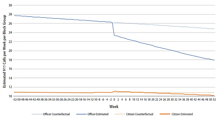 As Figure 1 demonstrates, the base rate of weekly resident 911 calls was relatively constant over the reporting period and remained substantively unchanged after a brief increase after the shooting. However, the significant and dramatic reduction in officer-initiated events persisted in the year after the shooting.