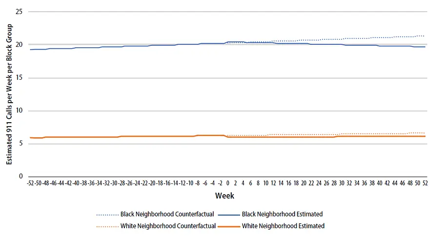 Following the original method, we implemented a negative binomial model with block group and month fixed effects and time indicators. We set exposure to the total population of the block group. We created two models—one focused on resident-initiated 911 calls and one on internal police calls—to test for changes in the level and slope of these outcomes after the event. We modeled the volume of all discretionary resident-initiated calls among block groups that are predominantly (> 65 percent) Black or predominantly White, controlling for the percentage of the population that is Black, the percentage of the population that is Hispanic, the percentage of households living in poverty, the percentage of households that rent versus own their home in the block group, and the daily high temperature recorded at the nearest weather station. We included weekly crime counts to control for changes in crime that could otherwise explain the volume of calls. When analyzing internal police calls, we also included a control for weekly resident-initiated 911 calls in the neighborhood.