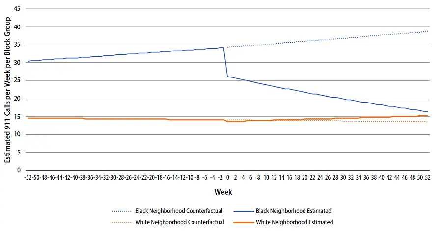 One clear question regarding the decline in resident calls to 911 within predominantly Black communities is, what do these changes represent? As Desmond and others have argued, similar high-profile incidents of police violence exacerbate legal cynicism in the communities most directly affected, which in turn reduces the likelihood of their participation in crime reporting. In other words, the use-of-force incident was a tipping point within communities where confidence and trust in the police was already strained. Less desire to call 911 is a clear indicator of a breakdown in trust and the perceived legitimacy of the police. The implications are that the killing of a Black person by a police officer reduces voluntary and proactive crime reporting to law enforcement, particularly in Black communities. That may in turn undermine public safety and the ability to hold criminal offenders accountable.