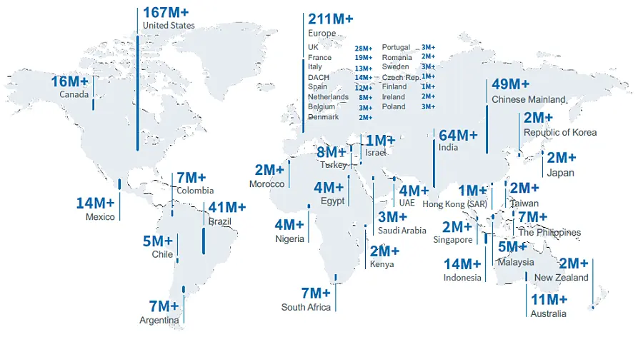 To be sure, access to digital resources is uneven and prone to inequity (DiMaggio et al., 2004), and not all youth may be able to use these job search tools. Yet with more than one million new users coming online each day, more than four billion current Internet users, and three billion social media users, use of these assets is extensive and growing (Kemp, 2019). Worldwide, more than 675 million individuals and 20 million companies use LinkedIn, making it the world’s largest digital professional networking and job-related platform. More than 75% of LinkedIn users come from outside the United States (Figure 1) (LinkedIn, 2020b, 2020a).
