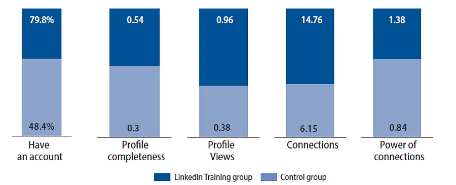 Through an agreement with LinkedIn and with informed consent from the participants, researchers gained access to data on the trainees’ LinkedIn usage (i.e., profile completeness, network metrics, and site usage) at the end of training and at 6 and 12 months post-training. The LinkedIn training had significant effects on both LinkedIn uptake and usage, increasing the percentage of participants with LinkedIn accounts from 48% to almost 80% (Figure 2, bar 1). Compared with participants who had not received the LinkedIn training, those trained on LinkedIn had more-complete profiles (Figure 2, bar 2), were more likely to have their profile viewed by others on the platform (Figure 2, bar 3), had more than twice as many network connections (Figure 2, bar 4), and connections that were more “powerful,” as defined by LinkedIn (Figure 2, bar 5) (Wheeler et al., 2019). Neither the treatment group nor the control group used the platform to view or apply for jobs in any significant way.