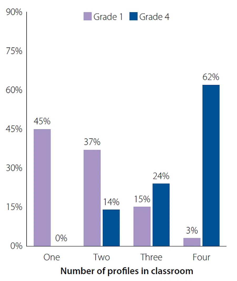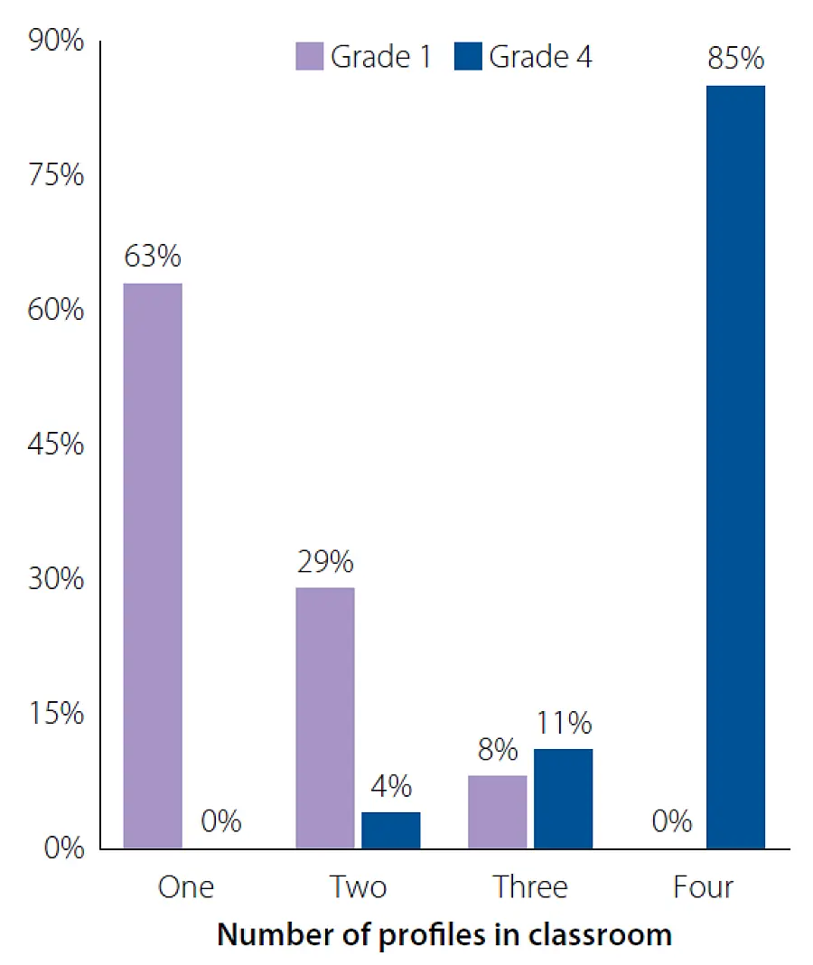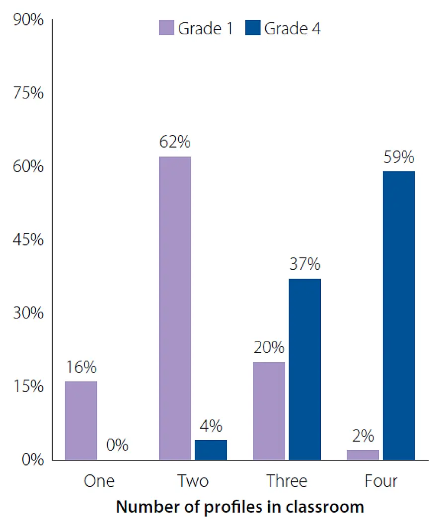 By Grade 4, most (59 to 85 percent) of the classrooms had four profiles. The skills represented by these four profiles ranged from those expected at the onset of Grade 1, such as not knowing any words, to reading fluently with comprehension and being ready for more complex text. Heterogeneous profiles within classrooms are a well-documented phenomenon and are consistent with what we know about how reading skills develop; that is, some children progress faster than others (Lervåg & Hulme, 2010; Vellutino et al., 1996). Consequently, Grade 4 instruction must respond to the heterogeneous profiles through differentiated instruction or strategic and limited use of homogeneous groupings based on learner profiles. Additional strategies may include team teaching or inviting volunteers to the classroom to assist the teacher. The precise model selected to support the heterogonous classroom is secondary to recognizing that all students need instruction at their current ability level. Without learner-profile-appropriate instruction, students will not progress efficiently.