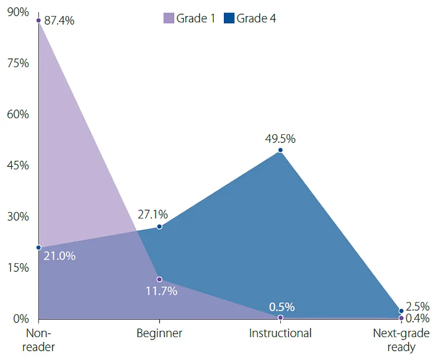 Students in the Fluent category—reading accurately and automatically, about a word per second, but with low comprehension—essentially did not exist in these three Uganda data sets. In each of the three languages, less than one percent of students were Fluent (0.22 percent Ganda, 0.34 percent Lango, 0.1 percent Runyankore-Rukiga). We found that in all three languages, the reading rates (correct words per minute, or cwpm) had an asymmetrical distribution that skewed to the right. Therefore, we dropped the Fluent category and proceeded with just four profiles: Nonreader (0 cwpm), Beginner (1–20 cwpm), Instructional (at least 21 cwpm but unable to finish the entire passage), and Next-Level Ready (read entire passage with at least 80 percent comprehension).