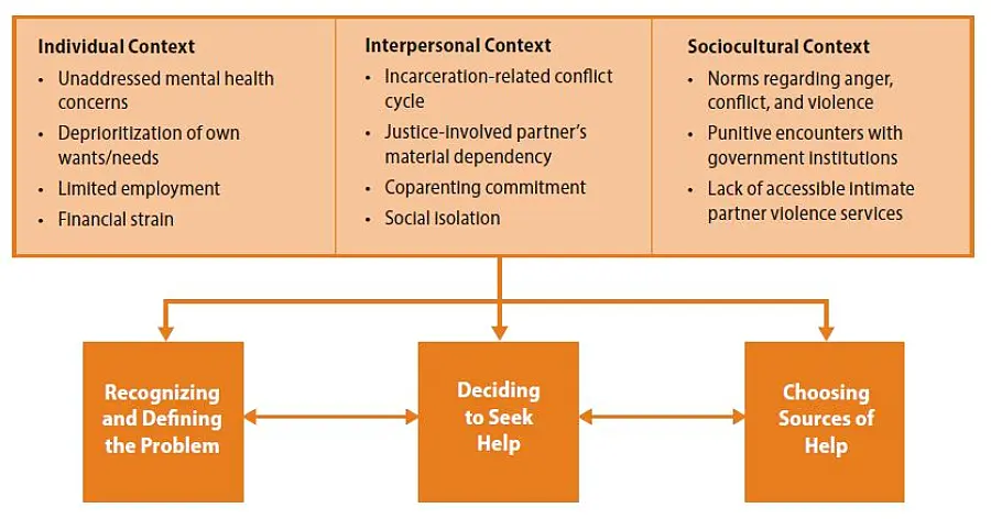 Liang et al.’s (2005) help-seeking model suggests three distinct processes involved in help-seeking among partner violence victims: recognizing and defining the problem, deciding to seek help, and choosing a source of support (Liang et al., 2005). All three are influenced by the individual, interpersonal, and sociocultural context (Figure 1) (Liang et al., 2005). Qualitative data from Multi-site Family Study participants indicates that, for couples affected by incarceration, distinct barriers can interfere with each of these processes.