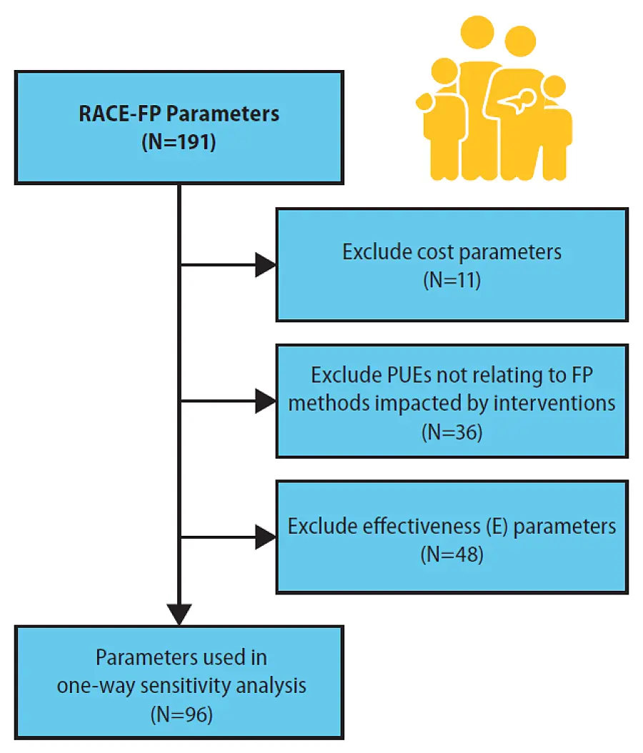 Run one-way sensitivity analyses, using the number of unplanned pregnancies as the outcome of interest, on each of the remaining 96 parameters to identify the 20 most impactful via the width of the range on the outcome.