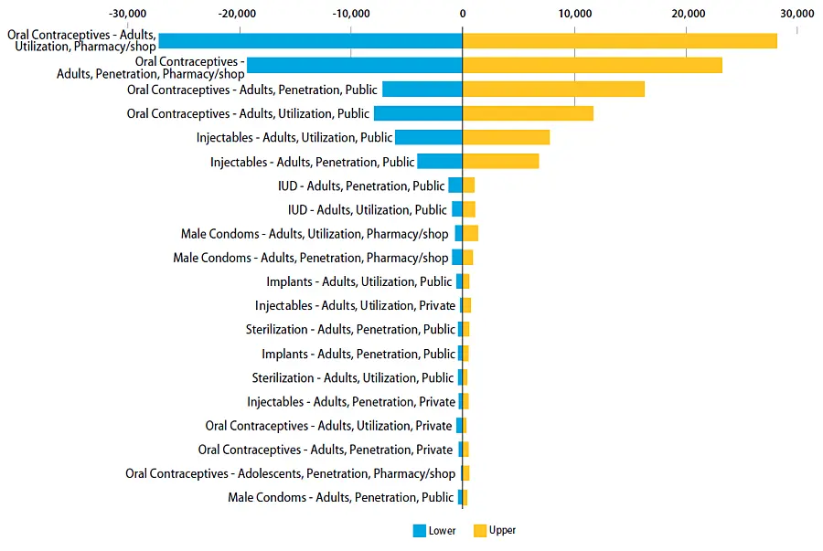 The PSA tool used the 20 parameters highlighted in Figure 3 to generate the full output of a 500-iteration multivariate PSA for the baseline, including minimum, maximum, median, and mean values for all modeled outcomes, as shown in Supplement F: Model Sensitivity Results. Table 6 shows an excerpt of results from Supplement F. The number of contraceptive users had a range of approximately 470,000, varying between 7.10 million and 7.57 million, with a mean of 7.33 million. mCPR was between 23.4% and 25.1%, with a mean and median of 24.3%. The number of unintended pregnancies had a range of roughly 140,000, varying between 1.35 million and 1.49 million, with a mean of 1.42 million.