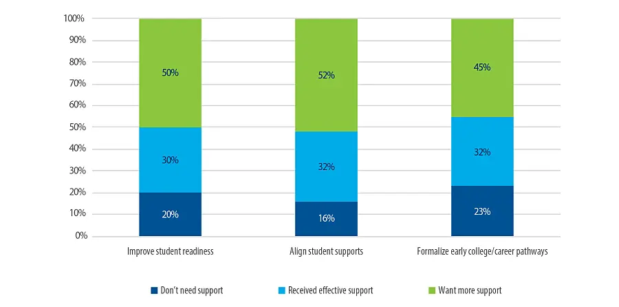 In the survey, we asked about program participants’ perceptions of this intermediary’s assistance to improve student success, align collaborative student supports, and formalize early college and career pathways. Participants could respond that they did not need support in an area, that they had received effective support, or that they wanted more support (Figure 1). For each question, about half of the respondents said they did not need help or that they received effective support; however, about half of the respondents said they would like more support.