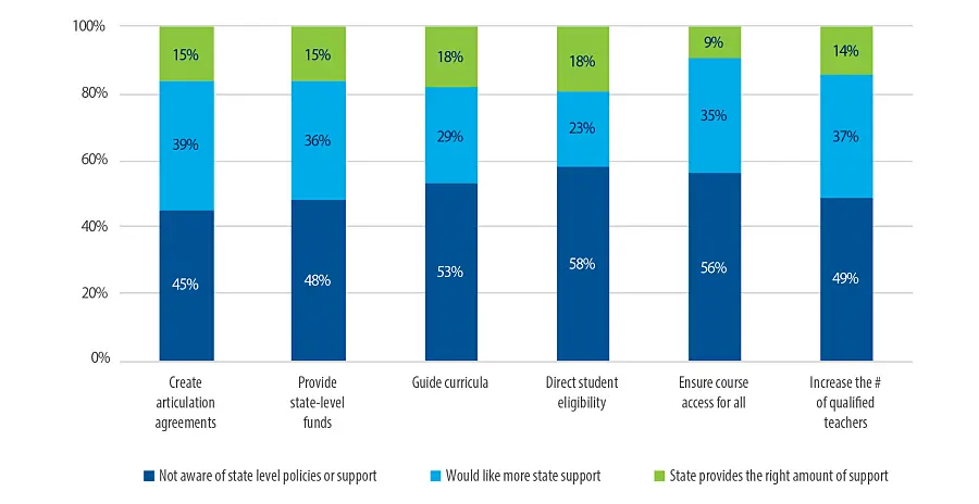 Implementing dual enrollment is easier when the state provides policy and financial supports (J. A. Edmunds et al., 2022). The programs in the OMIC initiative focused on enrolling and supporting economically disadvantaged students, but nationally, very few dual enrollment programs provide incentives to encourage participation by underserved students (Education Commission of the States, 2022a). Overall, participants in the OMIC dual enrollment projects would have appreciated more support from the state. We asked survey respondents their perceptions of the following state supports: creating articulation agreements, providing state-level funds, guiding curricula, directing student eligibility, ensuring course access for all, and increasing the number of qualified teachers. For each of these supports, respondents could say they were not aware of state-level policies or support, they would have liked more support, or the state provided the right amount of support (Figure 2). For each item, fewer than 20% said the state provided enough support. About one-quarter to one-third of respondents said they would like more state support in each area. About half of the time, respondents did not know whether the state provided this kind of support.