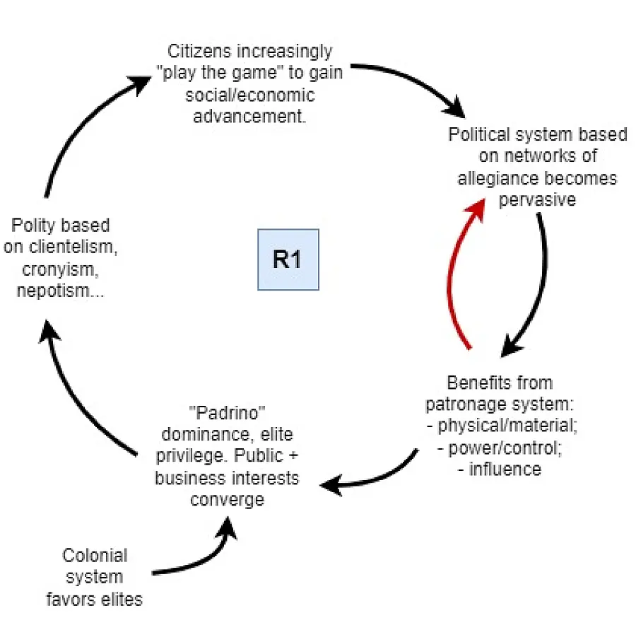 The national political system operates through networks of allegiance, in which the participants gain tangible and intangible benefits, in the form of material rewards, as well as power and influence (the red/black arrows on the right of the figure). These benefits reinforce the dominance of the patronage system and elite privilege.