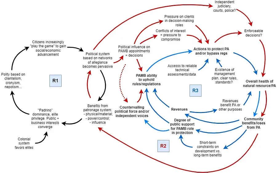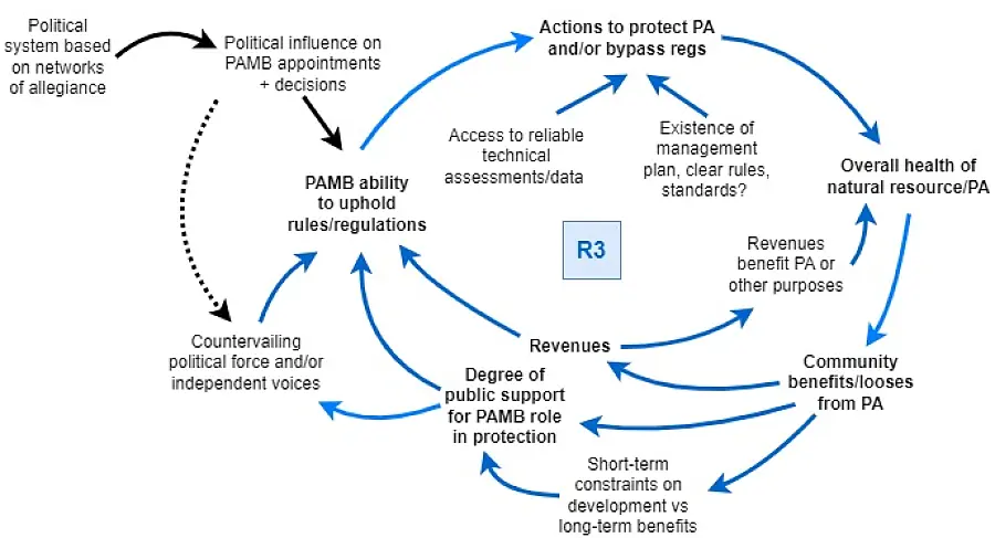 Figure 4 shows the three reinforcing loops (R1, R2, R3) combined in an overall systems map of the dynamics surrounding PAMB decision making. It was clear that how this system would function could differ significantly from PA site to PA site across the country reflecting local social, economic, political, and conservation conditions.