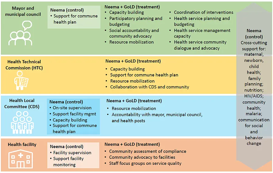 Figure 2 shows the specific Neema-only (control) and Neema and GoLD (treatment) interventions at mayor and municipal council, HTC, CDS, and facility levels. The smaller, shaded boxes show interventions that Neema implemented in all communes. The larger horizontal bars show interventions that Neema and GoLD coordinate to implement in treatment communes. Thus, the horizontal bars, including boxes, represent the entirety of integrated interventions in treatment communes; the boxes represent health-sector activities occurring in control communes. Figure 2 underscores the substantial additional integrated activities at the municipal and HTC levels in treatment communes.