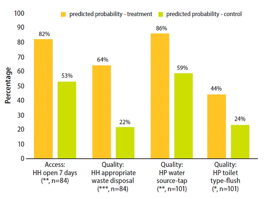 Health huts in treatment communes are more likely to be open (accessible) than health huts in control communes. On average, the predicted probability (likelihood) of a health hut in treatment communes being open 7 days a week is 82 percent, compared with 53 percent for control communes (see Figure 3).