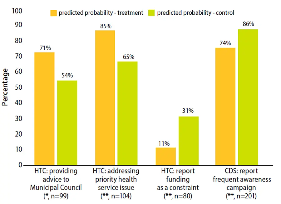 Treatment communes have better functioning HTCs that are more actively addressing health service problems. HTCs in treatment communes more often self-report providing advice to the Municipal Council (predicted probability 71 percent for HTCs in treatment communes, compared with 54 percent for controls; Figure 4) and addressing health service delivery issues in their commune5 (predicted probability 85 percent in treatment communes, compared with 65 percent for controls). These results suggest that HTCs exposed to integrated governance interventions are more actively working to improve health service delivery by engaging municipal decisionmakers and taking direct action to resolve problems. Furthermore, HTCs in treatment communes are less likely to report funding constraints (predicted probability 11 percent in treatment communes, compared with 31 percent for controls).