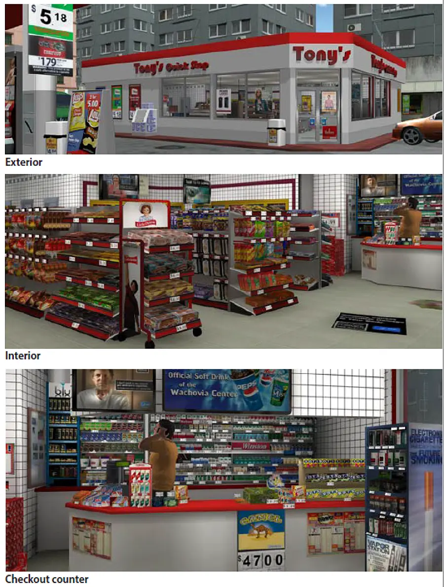 To fill this gap in the literature, we used 3D eye tracking to examine how much visual attention current cigarette smokers paid to different types of pro-tobacco and anti-tobacco stimuli in a virtual convenience store called RTI iShoppe®. Virtual stores provide a flexibility in ad placement that may not be possible in physical convenience stores. Previous research has demonstrated the ability of virtual convenience stores to provide information about consumer behavior (van Herpen et al., 2016).